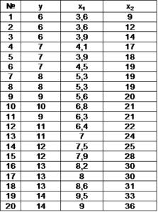 По 20 предприятиям региона изучается зависимость выработки продукции на одного работника y (тыс.руб.) от ввода в действие новых основных фондов х1 (% от стоимости фондов на коней года) и от удельного веса рабочих высокой квалификации в общей численности рабочих х2 (%).