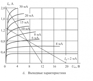 Определить точку покоя резисторного усилителя (рис. 2.3) на транзисторе 2Т860 А, если: Uп = 16 В, Rк = 9,0 Ом, Rэ= 1 Ом, Rб1 = 650 Ом, Rб2= 100 Ом, h21э = 140. Характеристики транзистора приведены в приложении на рис. П.1. Определить дифференциальный параметр h11э в точке покоя.