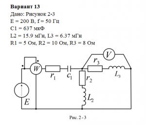 Задача 2. Для электрической схемы изображенной на рис. 2-1 -2-10, по заданным в табл. 2 параметрам и э.д.с. источника определить токи во всех ветвях цепи и напряжения на отдельных участках. Составить баланс активной и реактивной мощностей. Построить в масштабе на комплексной плоскости векторную диаграмму токов и потенциальную диаграмму напряжений по внешнему контуру. Определить показание вольтметра и активную мощность, показываемую ваттметром.