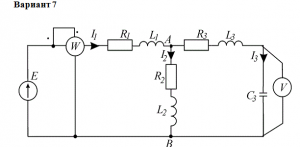 Для электрической схемы, изображенной на рисунке, по заданным параметрам и ЭДС источника, определить токи во всех ветвях цепи и напряжения на отдельных участках. Составить баланс активной и реактивной мощностей. Построить в масштабе на комплексной плоскости векторную диаграмму токов и потенциальную диаграмму напряжений по внешнему контуру. Определить показания вольтметра и активную мощность, показываемую ваттметром.