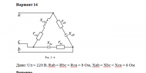 Для электрической цепи, схема которой изображена на рисунке, по заданным в таблице параметрам и линейному напряжению, определить фазные и линейные токи, ток в нейтральном проводе (для четырехпроводной схемы), активную мощность всей цепи и каждой фазы отдельно. Построить векторную диаграмму сил токов и напряжений на комплексной плоскости.