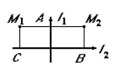 1. Два прямолинейных бесконечно длинных проводника расположены перпендикулярно друг к другу и находятся в одной плоскости (см. рис.) Найти напряженность магнитного поля в точках М1 и М2, если I1 = 2 A и I2 = 3 A. Расстояние АМ1 = АМ2 = 1 см, СМ1 = ВМ2 = 2 см.