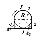 1. По плоскому контуру из тонкого провода течет ток I = 100 А. Определить магнитную индукцию В поля, создаваемого этим током в центре окружности (см. рис.). Радиус R изогнутой части контура равен 20 см.