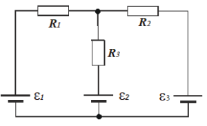- В схеме на рис. ε1 = 2 В, ε2= 4 В, ε3 = 6 В, R1 = 4 Ом, R2 = 6 Ом и R3 = 8 Ом. Найти силу тока во всех участках цепи. Сопротивлением элементов пренебречь.