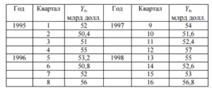 Имеются данные об объеме экспорта Yt из Российской Федерации (млрд. долл.) за 1995–1998 гг.
