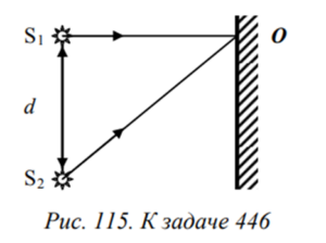- В опыте с зеркалами Френеля расстояние между мнимыми изображениями источника света с длиной волны 0,5 мкм равно: d =5мм. Расстояние от линии, соединяющей источники света, до экрана – 5 м. Что будет на экране напротив одного из источников – максимум или минимум света (рис. 115)?