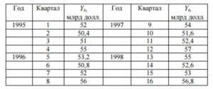 Имеются данные об объеме экспорта Yt из Российской Федерации (млрд. долл.) за 1995–1998 гг.