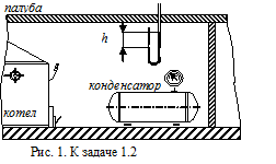 Задача 1.2. В машинном отделении миноносца (рис. 1) давление по водяному манометру h=95 мм вод.ст, показание палубного барометра B=720 мм рт.ст. Стрелка манометра котла указывает pм=18 ат. По вакуумметру на конденсаторе отсчет pв= 620 мм рт. ст.. Найти абсолютные давления: а) в помещении; б) в котле; в) в конденсаторе.