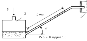 Задача 1.3. Разрежение в газоходе 1 (рис. 2) измеряется тягомером 2 с наклонной трубкой. Определить абсолютное давление в газоходе 1, если длина столба жидкости равна l в трубке тягомера 2, наклоненной под углом a = 30°. В тягомере находится вода с плотностью r = 1000 кг/м3. Показание барометра B. Давление выразить в Паскалях (Па), барах (бар), миллиметрах ртутного столба (мм рт. ст.) и килограммах силы на квадратный сантиметр (кгс/см2).