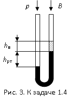 Задача 1.4. Ввиду вредного влияния оказываемого ртутными парами на человеческий организм при пользовании ртутными манометрами над уровнем жидкой ртути обычно наливается слой воды, препятствующий выделению паров ртути. Определить абсолютное давление в сосуде, если высота ртутного столба в U-образном манометре (рис. 3) составляет hрт, высота столба воды над ним hв и атмосферное давление B. Численные значения величин приведены в табл. 1.4.