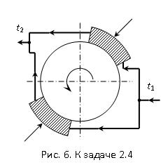 Задача 2.4. При испытании двигателей для определения мощности необходимо их тормозить (рис. 6). При этом работа, произведенная двигателем, расходуется на преодоление сил трения и превращается в теплоту, часть которой (примерно 20 %) рассеивается в окружающей среде, а остальная часть отводится охлаждающей тормоз водой. Сколько воды необходимо подводить к тормозу за 1 ч, если крутящий момент на валу Мкр, частота вращения n, а допустимое повышение температуры воды Dt. Теплоемкость воды принять равной     ср = 4,19 кДж/(кг×К). Данные в табл. 2.4.