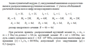 Задан ступенчатый вал(рис.2), нагруженный внешними сосредоточенными и распределенными крутящими моментами . С учетом обобщенной расчетной схемы вала и цифр номера варианта имеем: