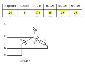 Для схемы электрической цепи по заданным в таблице 3 параметрам и линейному напряжению, определить фазные и линейные токи в нейтральном проводе (для четырехпроводной схемы), активную мощность всей цепи и каждой фазы отдельно. Построить векторную диаграмму токов и напряжений на комплексной плоскости.