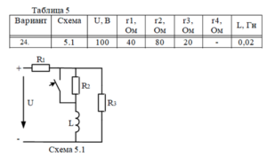 Для схемы электрической цепи, изображенной на рисунке 5, по заданным в таблице 5 параметрам рассчитать токи и напряжения всех ветвей электрической цепи в переходном процессе после замыкания (либо размыкания) ключа. Построить графики изменения тока и напряжения