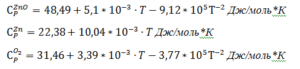 1. Вычислить теплоту образования оксида цинка при 327ºС, если его теплота образования при 298К равна -349,0 кДж/моль. Молярные теплоемкости ZnO(т), Zn(т) и O2(г):